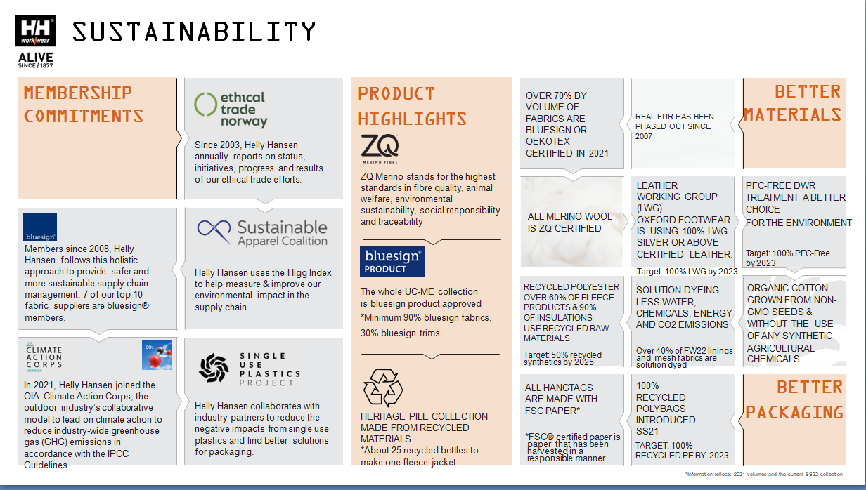 Helly Hansen kreira opremu profesionalne klase koja pomaže ljudima da ostanu i osećaju se zaštićeno u najsurovijim životnim okruženjima. Primenjujući holistički i naučni pristup u svim odlukama Helly Hansen, nastoji da obezbedi da te aktivnosti podržavaju sposobnost ljudi i planetu da napreduju.