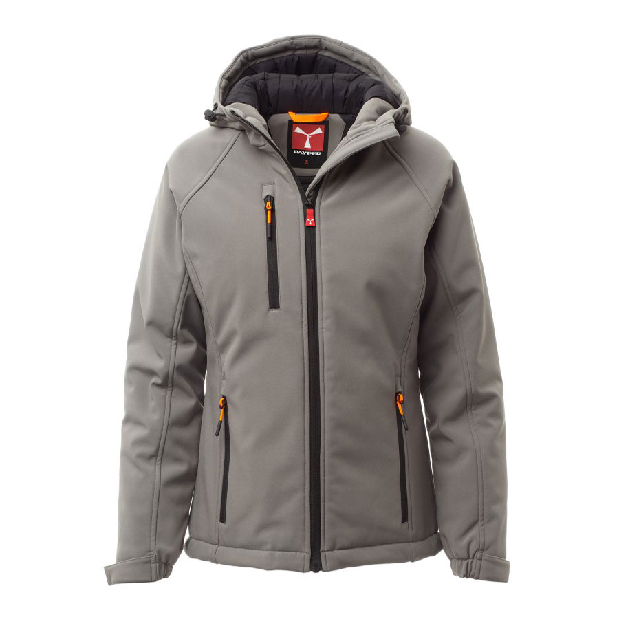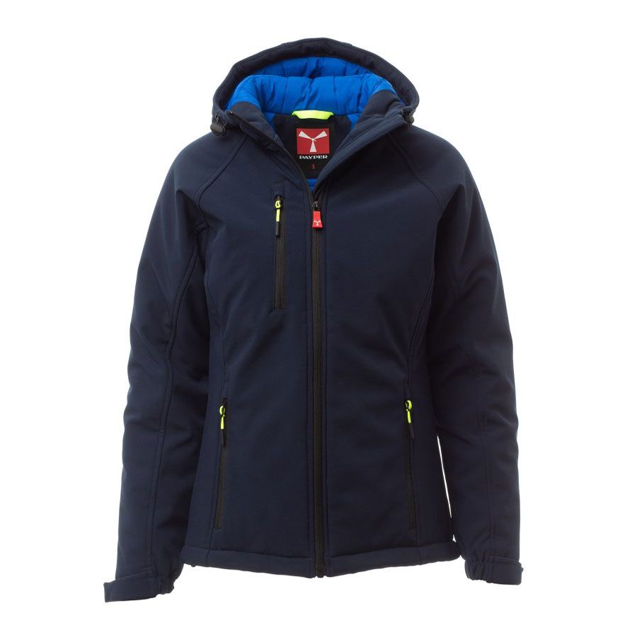 Zimska vodootporna i vetrootporna ženska softshell jakna sa metalnim kliznim patentnim zatvaračem sa funkcijom poluautomatskog zatvaranja. Kapuljača je napravljena sa podesivim kanapom. Dva bočna džepa i jedan džep na grudima sa patent zatvaračem. Ima dva unutrašnja džepa, jedan sa patent zatvaračem, a drugi je držač tableta sa čičak kopčom.