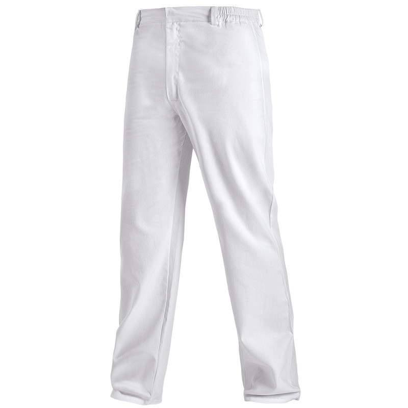 Muške radne pantalone bele boje po HACCP standardu. Elastična traka oko struka, kopčanje učkurom sa unutrašnje strane. Šiveno od kvalitetnog pamuka (100% pamuk, 200g/m2) koji je paropropusan i lak za odžavanje – može se prati na visokim temperaturama i lako peglati. Prikladni su za korišćenje u prehrambenoj industriji, farmaceutsko industriji, medicini, kuhinjama, apotekama i sl.