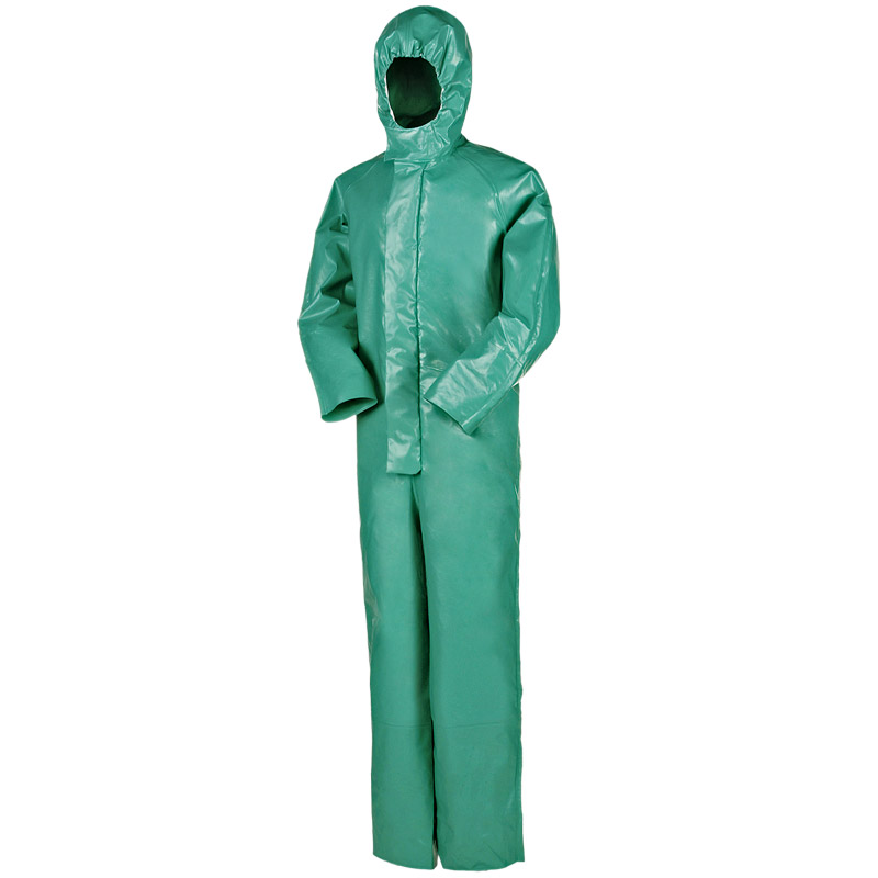Višekratni hemijski kombinezon renomiranog proizvođača SIOEN, proizveden od Chemtex materijala (poliester tkanina obostrano obložena PVC-om, 360 g/m2) je odlično rešenje za intenzivnu upotrebu u industrijskom okruženju. Posebno je otporan na cepanje. Štiti od tečnih hemikalija, ulja i maziva. Ima elastične manžetne u rukavima i na člancima. Bez postave. Kapuljača je fksirana za odelo, zatvaranje je rajsfešlusom pod duplim preklopom sa čičkom i drikerima. Raglan rukavi. Posebnim preklopom je zaštićena oblast vrata i brade. Artikal je zamena za JSP kiselootporni kombinezon (OD-085).