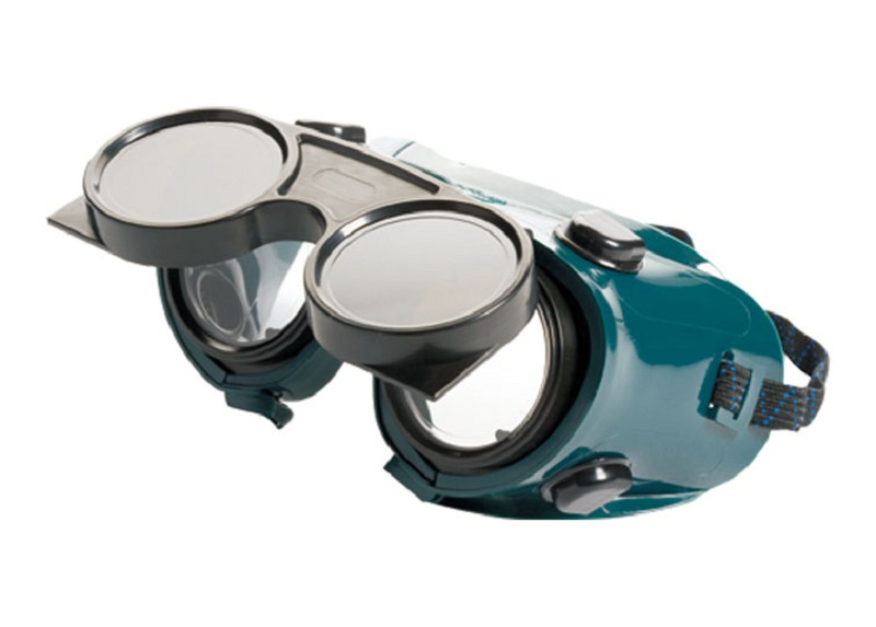 Naočare za zavarivače na preklop, sa ventilima. Mekani PVC ram, elastična podesiva traka, polikarbonatna stakla DIN 5, unutrašnja polikarbonatna bistra stakla.